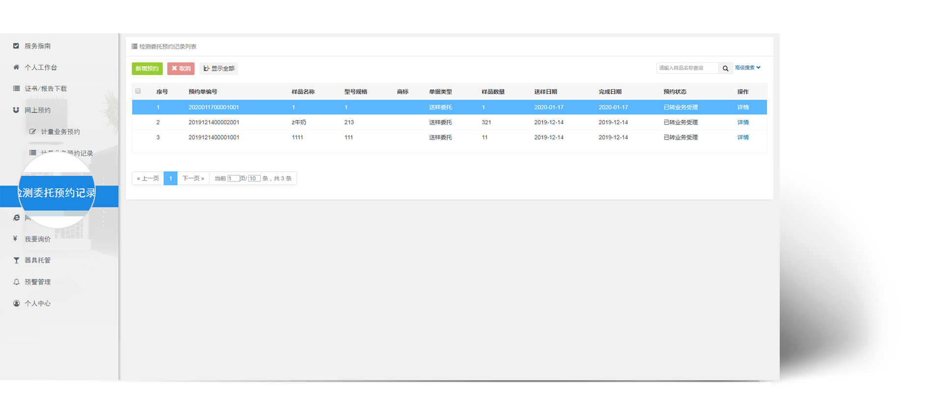通过业务服务平台报检,报检成功后可通过检测委托预约记录节点进行状态追踪。
