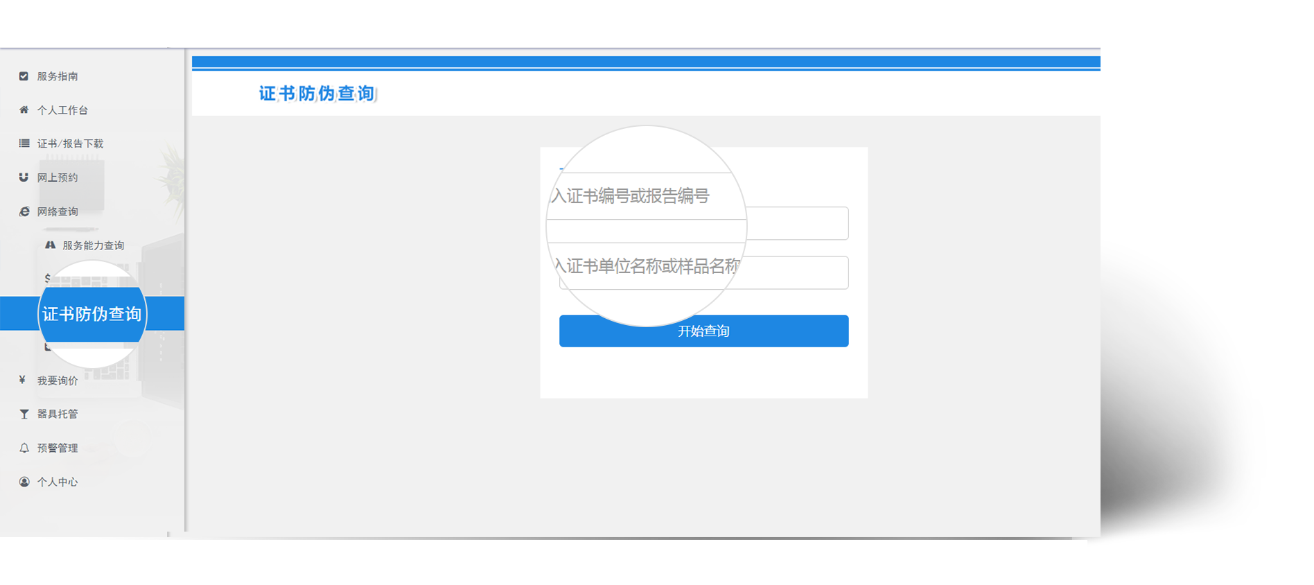 证书防伪查询:企业可以输入证书/报告编号以及证书单位名称/样品名称进行证书/报告防伪验证。