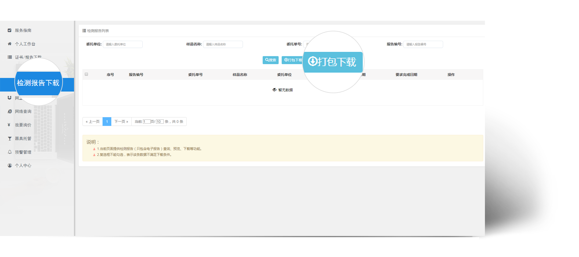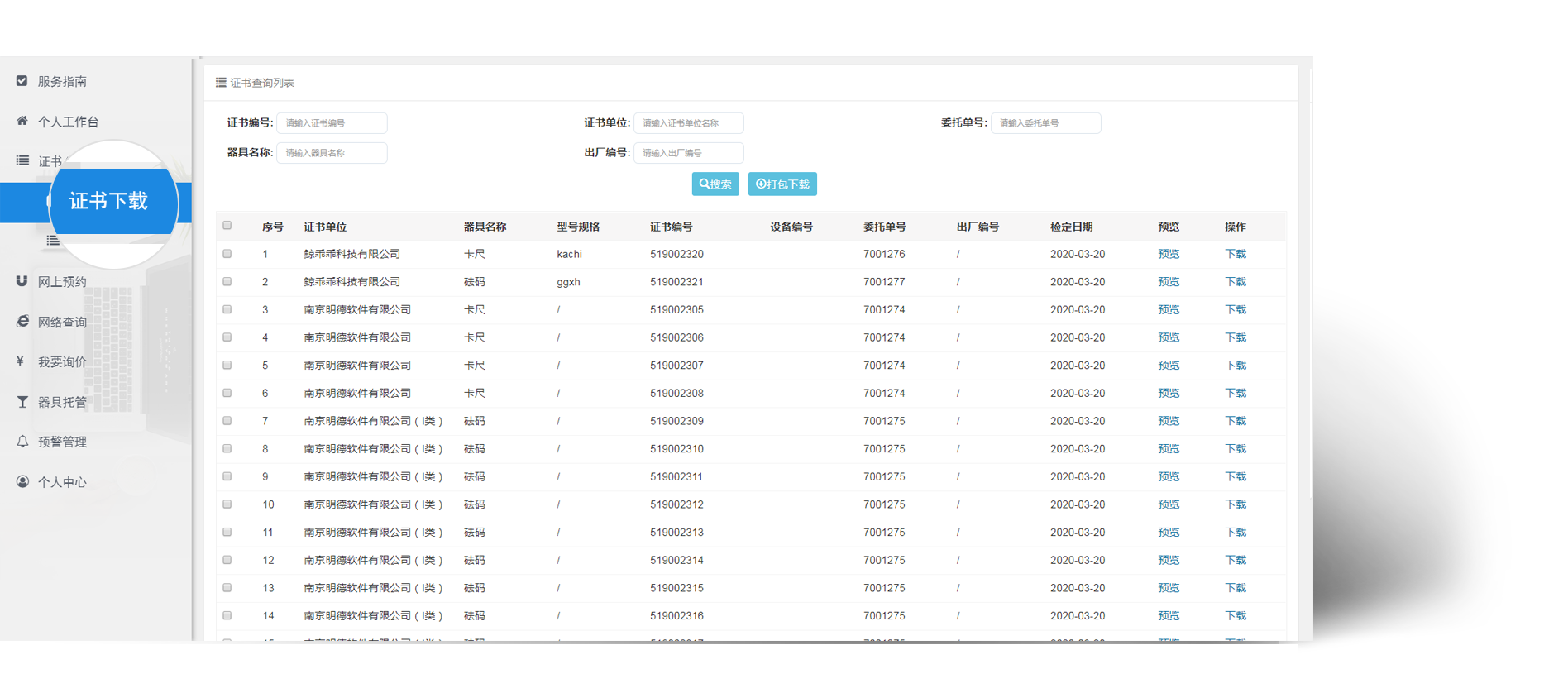 如果企业在报检的时候选择了电子证书,待器具检测完毕缴纳费用之后,切可自行在此模块进行电子证书/报告的查看和下载。