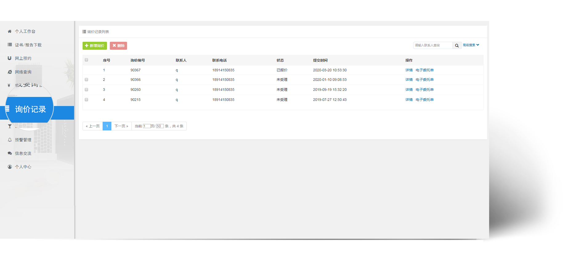 企业如果需要跟机构咨询某些器具价格时,可通过询价平台完成。企业进入我要询价节点 , 可通过多途径进行器具录入。提交后 , 机构人员会受理并生成报价单。