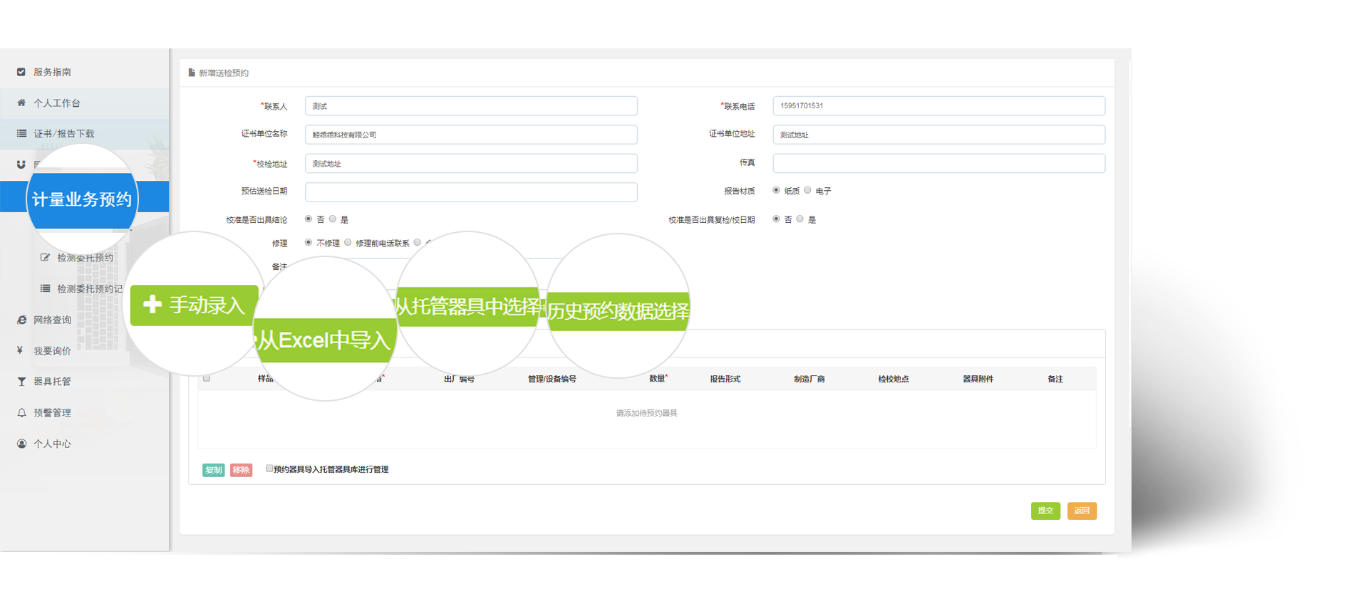 器具分别可以从手工录入、托管器具中选择、Excel导入、历史报检数据中选择四个入口录入。其中从托管器具中选择的器具检测完成后,自动更新检定信息。