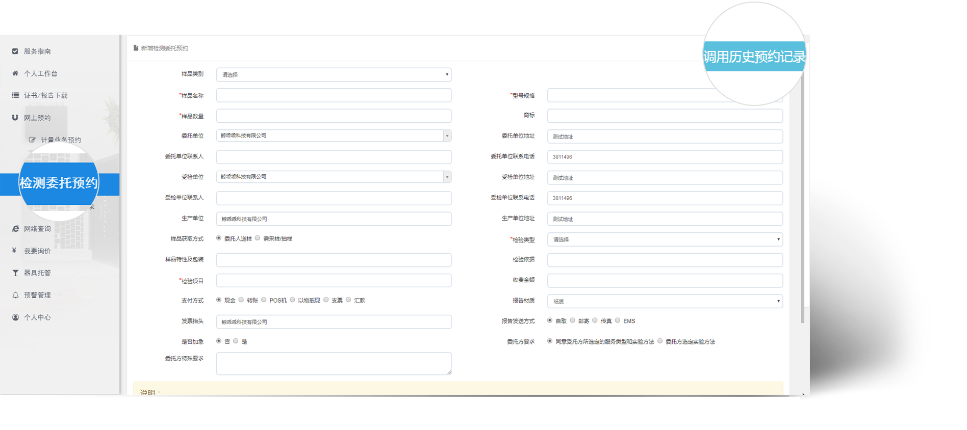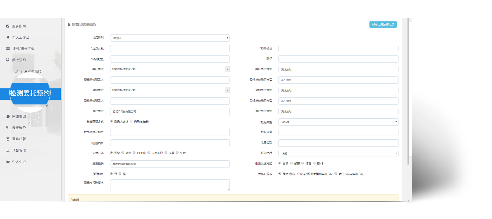 当企业需要送检时 , 企业可通过网上预约->检测委托预约进行预约送检,这样可以节省送检时填写委托单的时间,并在线选择需要检验的项目信息。