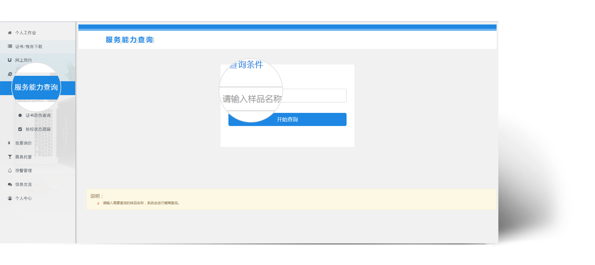 服务能力查询:企业可以输入器具/样品名称,查询机构是否具备检校资质。