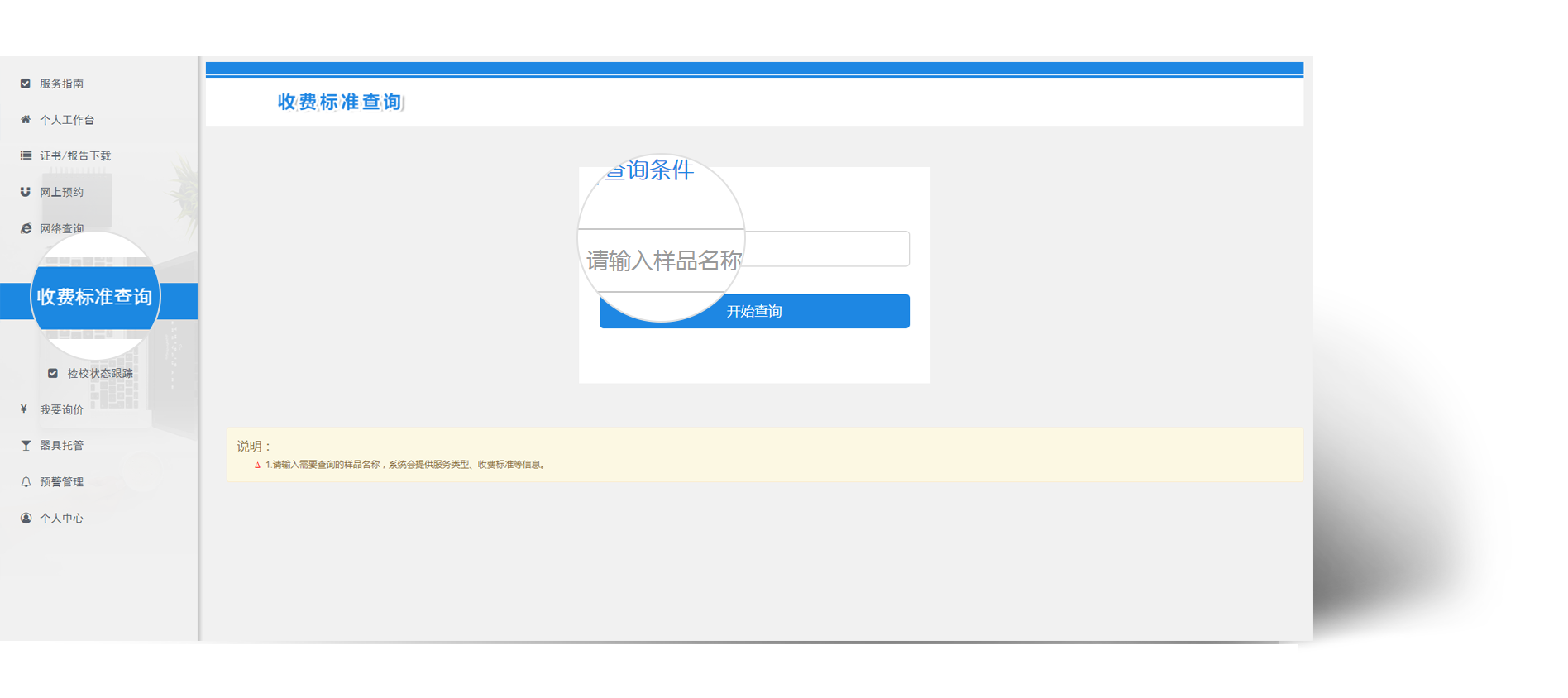 收费标准查询:企业可以输入器具/样品名称,查询机构的标准价格。
