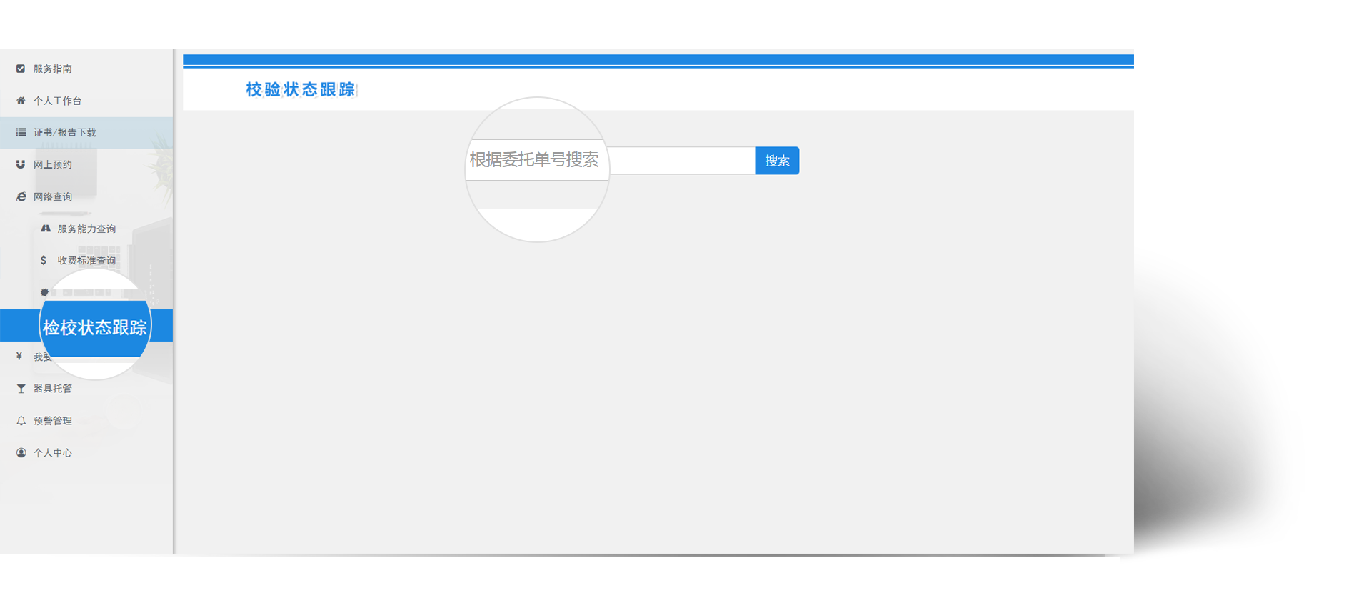 检校状态跟踪:针对通过业务服务平台或者且经过平台报检的委托单,企业均可在此查询对应的检校进度。