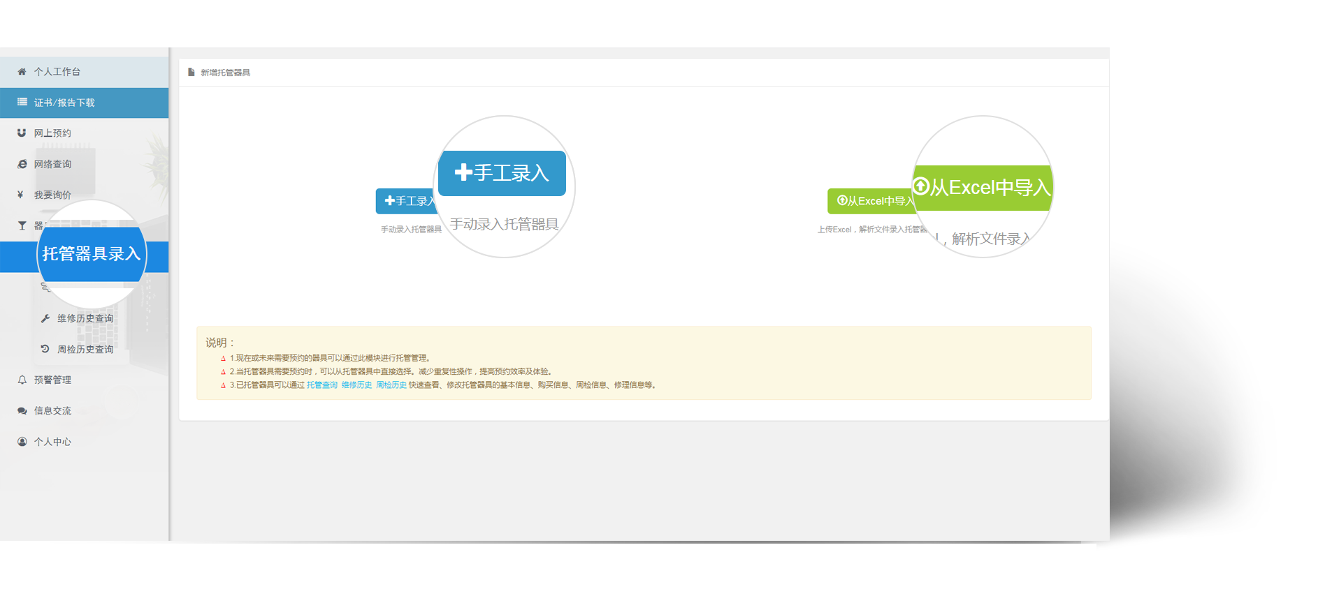 企业可通过器具托管节点,将器具录入系统。(系统支持手动录入,或者通过下载excel模板,填写器具信息后进行批量导入)