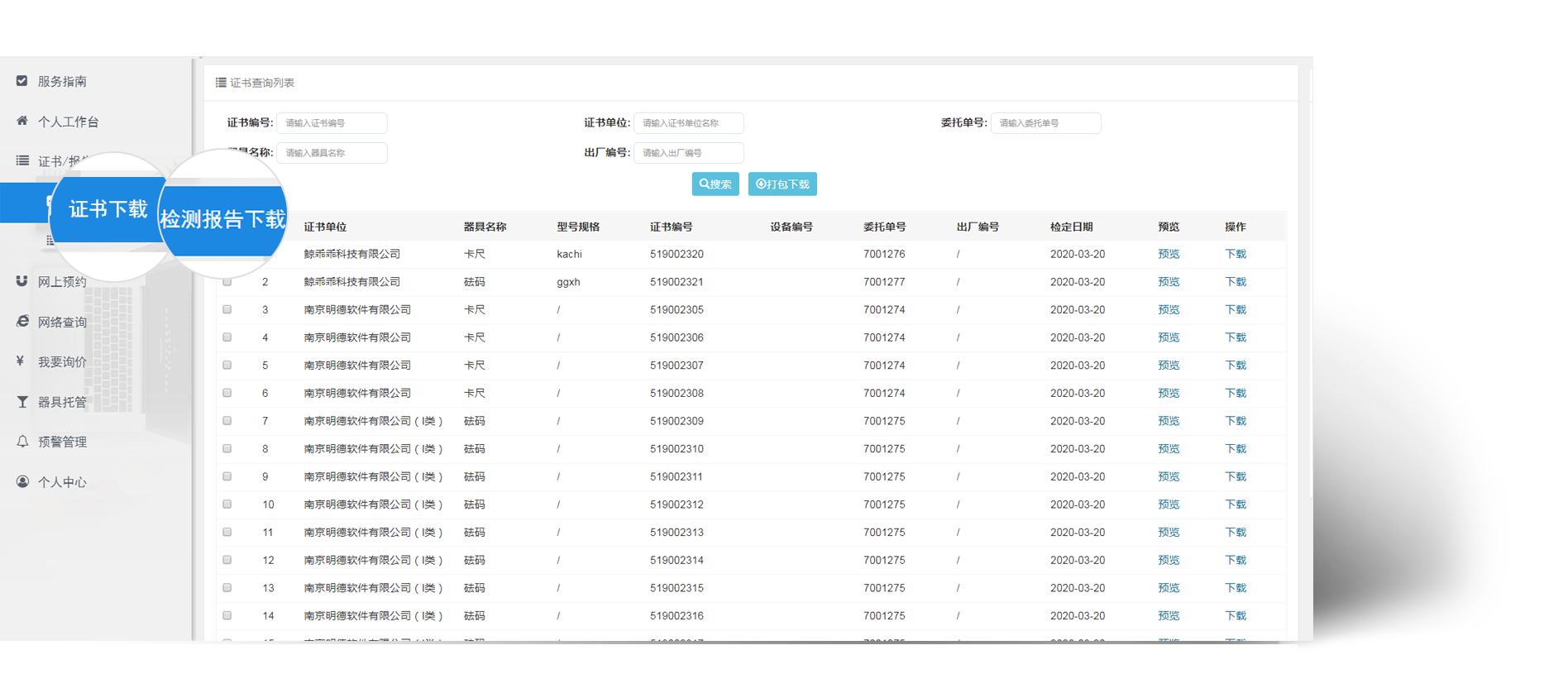 如果企业在报检的时候选择了电子证书,待器具检测完毕缴纳费用之后,切可自行在此模块进行电子证书/报告的查看和下载。