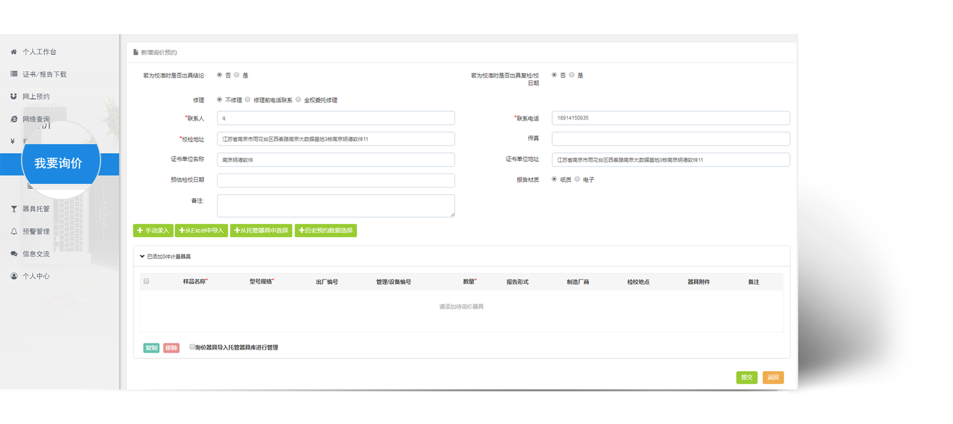 企业如果需要跟机构咨询某些器具价格时,可通过询价平台完成。企业进入我要询价节点 , 可通过多途径进行器具录入。提交后 , 机构人员会受理并生成报价单。