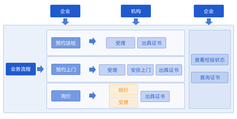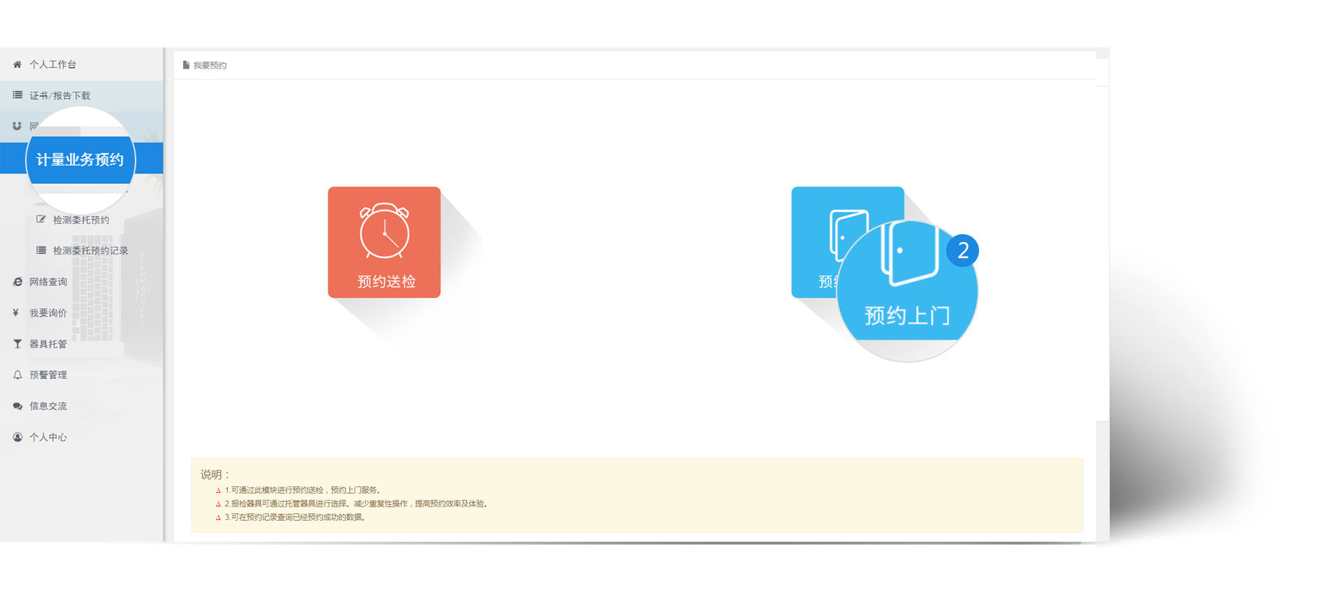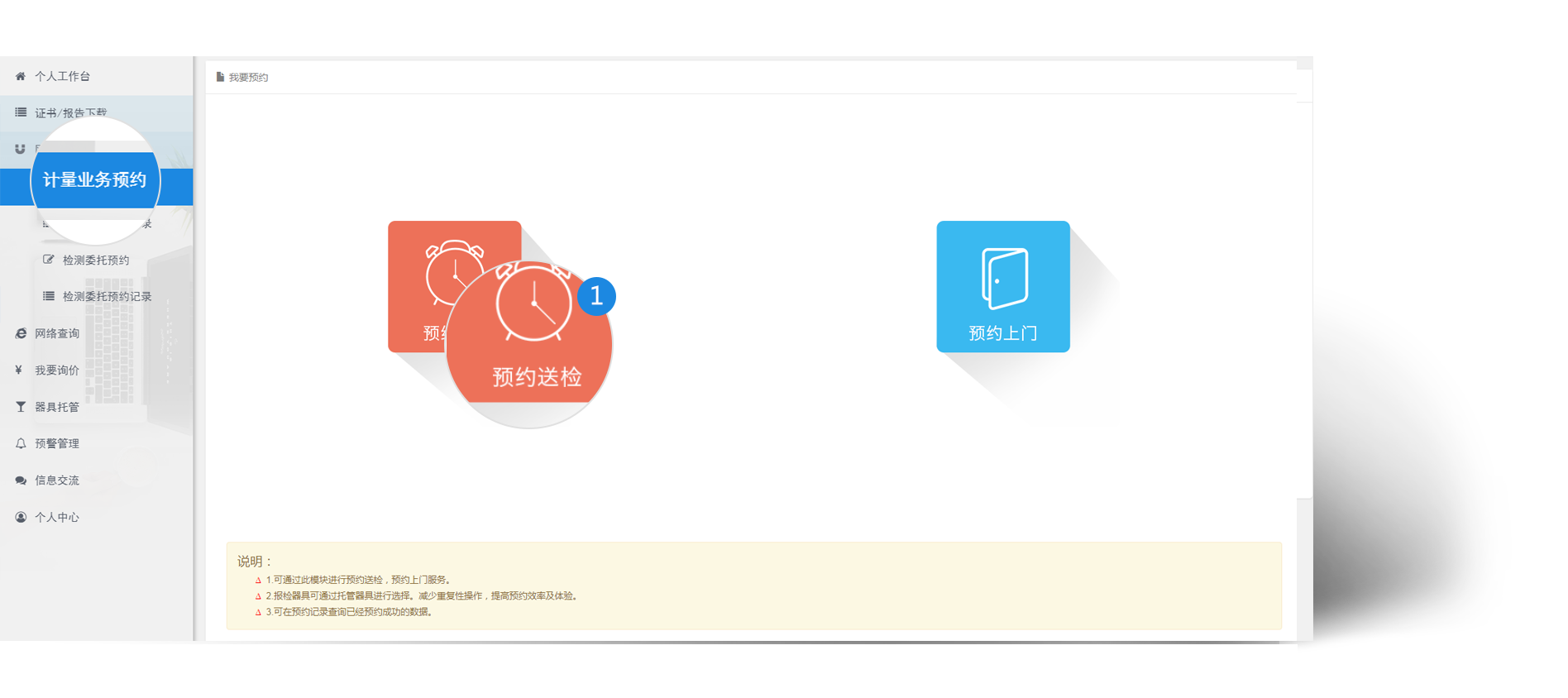 当企业需要送检时 , 企业可通过网上预约->计量业务预约进行预约送检 , 这样可以节省送检时填写委托单的时间。